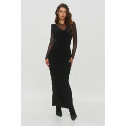 Nestručná černá šaty, které vyzařují eleganci a jemnost. Model má přiléhavý střih, který podtrhuje postavu. Žebra na bocích dodávají strukturu a zdůrazňují pas a boky, zároveň maskují nedokonalosti postavy. Šaty mají dlouhé průhledné rukávy zítřka, které vytvářejí jemný kontrast s neprůhledným tělem šatů, přispívající k jejich elegantnímu a modernímu vzhledu. Výstřih je kombinací průhledné látky a výstřihu ve tvaru písmene V, který přidává návrhu smyslný charakter. Navíc na ramenou jsou umístěny efektní polštářky, zdůrazňující linii ramen. Elegantním doplňkem je pozlacený knoflík umístěný na zádech šatů, který usnadňuje volné oblékání kreace. Šaty sahají až po kotníky a mají koketní rozpark, umožňující volnost pohybu a přidávající jemný půvab. Model je ideální na formální příležitosti nebo večerní vycházky, vyvažuje eleganci s nádechem drzosti.