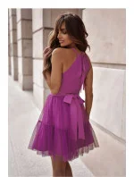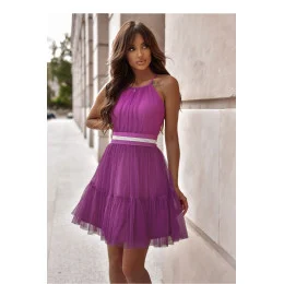 Elegantní síťové šaty s ramínky a nastavitelným vázáním. Šaty se zapínají na skrytý zip. V pase ozdobný pás k uvázání. Spodek lehce rozšířený.