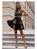 Elegantní tylové šaty na ramínka s nastavitelným vázáním. Šaty se zapínají na skrytý zip. V pase ozdobný pásek k uvázání. Dole lehce rozkročené.