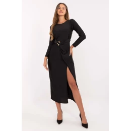 Elegantní večerní šaty s obálkovým střihem a midi délkou, vyrobené z hladké látky s decentním leskem. Model se skvěle hodí na společenské události a večírky, spojující eleganci s nádechem modernosti. Horní část s kulatým výstřihem a dlouhými rukávy vypadá velmi klasicky, a ozdobné záhyby dodávají celku rafinovaný charakter a zdůrazňují postavu. Obálkový spodní díl přidává lehkosti a ženské elegance, a převažující směs viskózy a polyesteru zaručuje pohodlí a elegantní vzhled. Šaty nemají zapínání, což podtrhuje jejich minimalistický, ale zároveň efektní styl.