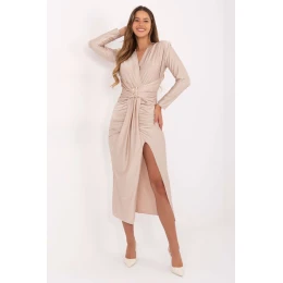 Večerní šaty s úzkým střihem, které zdůrazňují ženskou siluetu a spojují eleganci s moderním akcentem. Vyrobené z vysoce kvalitní viskózy s příměsí polyesteru, působí velmi elegantně a zároveň zaručují pohodlí při nošení. Hladký materiál krásně padne na tělo a midi délka dodává celku eleganci. Model vyniká vestavěnými polštářky na ramenou, které dodávají postavě výrazné proporce. Klopový výstřih jemně zdůrazňuje linii krku a dekoltu, zatímco záhyby na přední části s ozdobnou kovovou sponou přitahují pozornost a zdůrazňují pas. Šaty nemají žádné zapínání, což zaručuje pohodlí a komfort při oblékání. Ideální na společenské události nebo večírky, umožňují vytvořit stylizaci, která okouzlí elegancí a ženským šarmem.