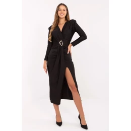 Večerní šaty ve štíhlém střihu, které zdůrazňují ženskou siluetu a spojují eleganci s moderním akcentem. Vyrobené z vysoce kvalitní viskózy s příměsí polyesteru, působí velmi elegantně a zároveň zaručují pohodlí nošení. Hladký materiál se krásně přizpůsobuje tělu a délka midi dodává celku eleganci. Model vyniká vsazenými polštářky na ramenou, které dodávají siluetě výrazné proporce. Přesýpací výstřih jemně zdůrazňuje linii krku a dekoltu, zatímco na přední straně se sklady s ozdobnou kovovou sponou přitahují pozornost a zdůrazňují pas. Šaty nemají zapínání, což zajišťuje pohodlí a komfort při oblékání. Ideální na společenské události nebo večírky, umožňují vytvořit outfit, který okouzlí elegancí a ženským půvabem.