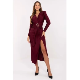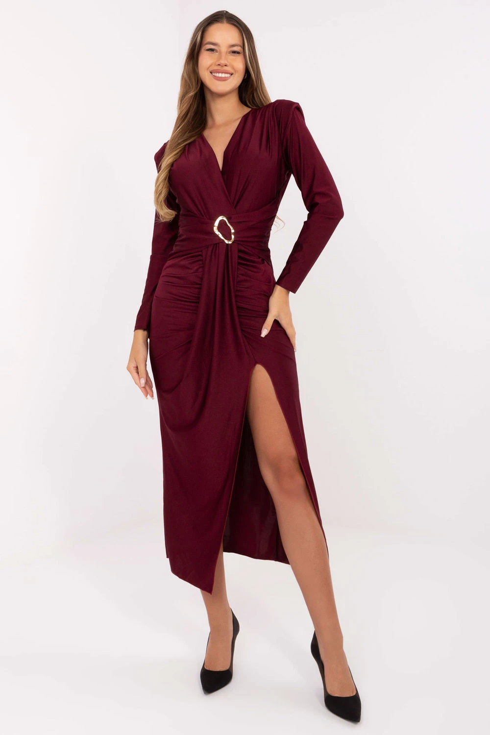 Šaty večerní s úzkým střihem, které zdůrazňují ženskou siluetu a spojují eleganci s moderním akcentem. Vyrobené z vysoce kvalitní viskózy s příměsí polyesteru, působí velmi elegantně a zároveň zaručují pohodlí nošení. Hladký materiál krásně padne na těle a délka midi dodává celku eleganci. Model vyniká vsazenými polštářky na ramenou, které dávají siluetě výrazné proporce. Záhyb na přední straně s ozdobnou kovovou sponou přitahuje pozornost a zdůrazňuje pas. Šaty nemají zapínání, co zajišťuje pohodlí a komfort při oblékání. Ideální na návštěvy nebo večírky, umožňují vytvořit stylizaci, která okouzlí elegancí a ženskou grácií.