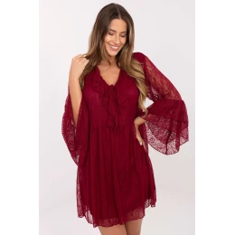 Nádherné šaty s roztančeným střihem z krajkové látky jsou návrhem, který podtrhne ženskost a přidá kouzlo každému outfitu. Vyrobené z jemné krajky s průsvitným vzorem s přídavkem nylonu a elastanu se krásně přizpůsobují postavě a zaručují pohodlné nošení. Model má podšívku, která zajišťuje pohodlí a elegantní dokončení. Výstřih do V s jemným šněrováním decentně zdůrazňuje krk, a šátek na přední straně a rukávy 3/4 zakončené volány přidávají romantický, stylový charakter. Šaty v mini délce jsou ideální na večírky, recepce, Silvestra nebo jiné společenské události, vytvářejíce oslnivý, elegantní outfit.