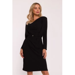 Elegantní tužkové šaty vyrobené z hladké látky s jemným, lehce lesklým povrchem. Model okouzluje smyslným výstřihem ve tvaru vody, který se jemně přizpůsobuje siluetě, zdůrazňujíc ženský charakter šatů. Dlouhé rukávy dodávají celku eleganci a zajišťují, že kreace se skvěle hodí jak na večerní vycházky, tak na elegantní setkání. Střih s volnějším vrchním dílem a se zužujícím se dnem krásně tvaruje postavu, a elastický pás z téže látky zdůrazňuje pas. Spodní část šatů má jednoduchý střih s jemným rozparkem po straně, který zajišťuje volnost pohybu. Šaty nemají zapínání, nasazují se pohodlně přes hlavu. Navrženo a ušito v Polsku s důrazem na každý detail.
