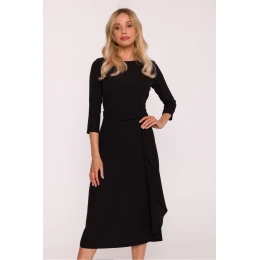 Elegantní koktejlové šaty s volánem jsou nabídkou pro ženy, které oceňují jemnou klasiku s nádechem modernosti. Vyrobené z hladké látky s jemným, vznešeným leskem, krásně vypadají v pohybu a skvěle se hodí na speciální příležitosti. Model má polokruhový výstřih a rukávy délky 3/4, které mu dodávají vyváženou eleganci. Silueta je lehce přizpůsobená, díky čemuž šaty zdůrazňují postavu, zachovávají však pohodlí nošení. Pas je jemně zvýrazněn střihem s materiálovou nadložkou, co opticky zeštíhlí a dodá celku harmonický tvar. Jednoduchý spodní lem je oživen ozdobným volánem běžícím podél boku sukně, což je efektní detail, který vnáší lehký ženský akcent. Na zádech je vysoký rozpark a zakrytý zip usnadňující oblékání. Navrženo a ušito v Polsku s důrazem na nejvyšší kvalitu provedení.