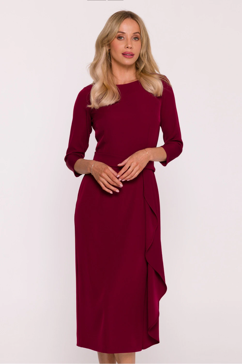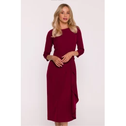 Elegantní koktejlové šaty s volánem jsou nabídkou pro ženy, které ocení jemnou klasiku s nádechem modernosti. Vyrobena z hladké látky s jemným, šlechtickým leskem, krásně vypadá v pohybu a skvěle poslouží při výjimečných příležitostech. Model má polokruhový výstřih a rukávy délky 3/4, které mu dodávají vyváženou eleganci. Silueta je lehce přizpůsobená, díky čemuž šaty zdůrazňují postavu, zachovávajíce zároveň pohodlí nošení. Pas je jemně zdůrazněn řezem s materiálovou náplastí, co opticky zúží a dodává celku harmonický tvar. Jednoduchý spodek byl oživen ozdobným volánem běžícím podél boku sukně, což je efektní detail, který přináší lehký ženský akcent. Na zádech je vysoký rozpark a skrytý zip usnadňující oblékání. Navrženo a ušito v Polsku s důrazem na nejvyšší kvalitu provedení.