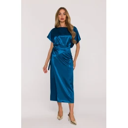 Jemný a elegantní středně dlouhý saténový šaty, který okouzlí jednoduchostí formy a vznešeným leskem látky. Vyrobený z hladkého, plného saténu, jemně obepíná siluetu a krásně odráží světlo, vytvářejíc efekt luxusní lehkosti. Model má dekolt typu loďka, který jemně zdůrazňuje linii ramen a krku, a krátké, volné rukávy dodávají lehkost a pohodlí. Horní část šatů má volnější střih, díky čemuž ji lze jemně pustit ze sukně, vytvářejíc volnou, přirozenou linii. Spodek je uvázaný jako pareo kolem pasu, což umožňuje přizpůsobení střihu siluetě a zdůraznění pasu stylovým, ženským způsobem. Šaty nemají podšívku, což zajišťuje, že zůstávají lehké, příjemné na dotek a ideální na teplejší dny. Model byl navržen a ušit v Polsku s nejvyšší pečlivostí o detaily. Jedná se o elegantní středně dlouhý saténový šaty, který kombinuje pohodlí, minimalismus a ženské kouzlo ideální na večírky, schůzky a letní příležitosti, kdy chcete vypadat elegantně, ale s přirozenou lehkostí.