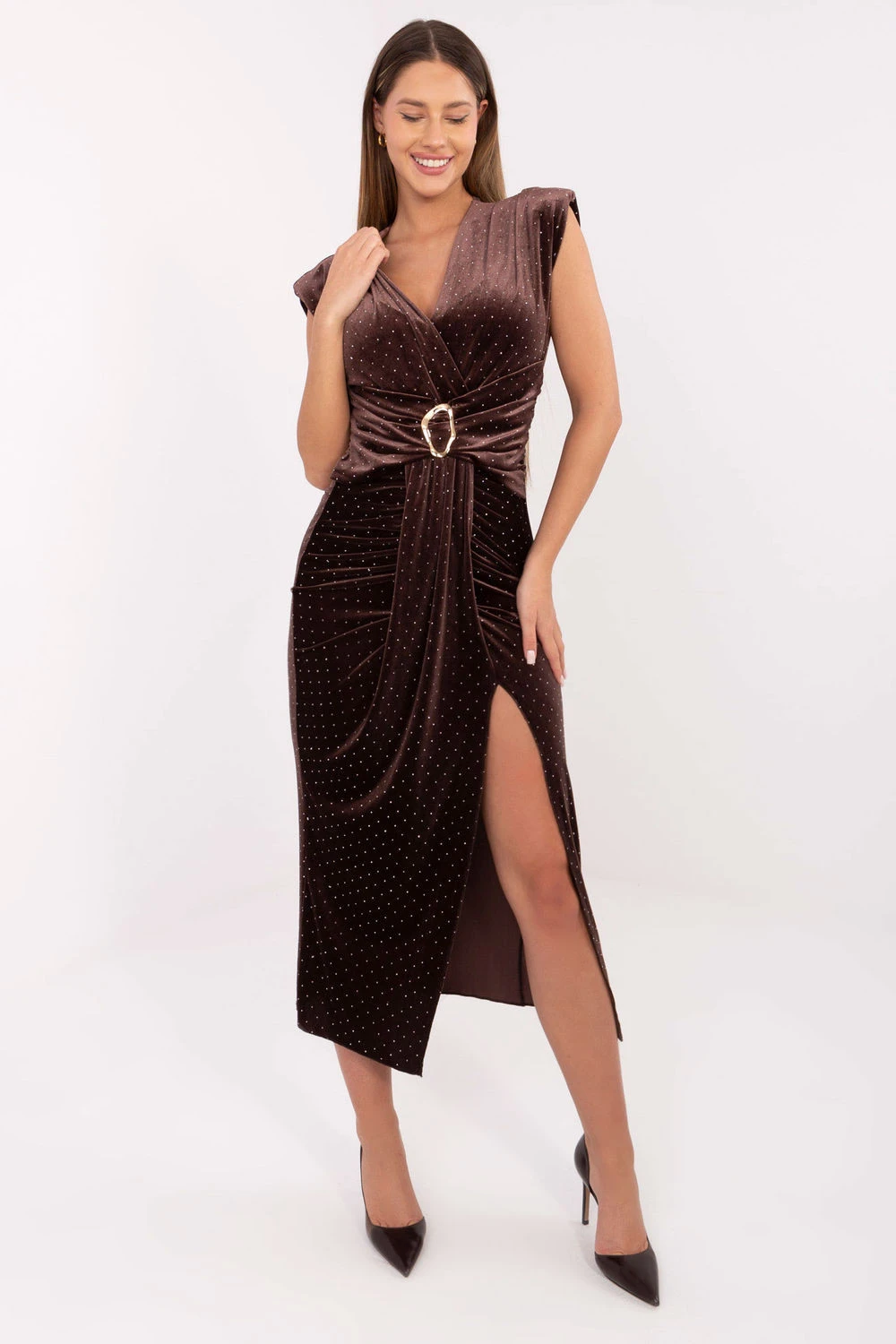 Elegantní, ženské midi tužkové šaty, navržené pro speciální příležitosti. Vyrobené z vysoce kvalitní směsi polyesteru a elastanu, poskytují skvělé přiléhání a pohodlí při nošení. Model je zdoben vloženými polštářky na ramenou, které dodávají siluetě elegantní a výrazný tvar. Křížový výstřih krásně zdůrazňuje linii dekoltu, a rozpark zepředu jemně odhaluje nohu, přidávajíc celku smyslný charakter. Na přední straně jsou drapérie s kovovým ozdoben, které opticky zeštíhlují pas a představují efektní detail. Šaty bez rukávů, bez zapínání, s flitry jsou nadčasové, ideální na návštěvy, večírky a elegantní přijetí.