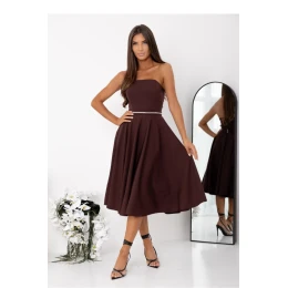 Elegantní šaty bez ramínek jsou návrhem, který spojuje klasický tvar s efektními detaily. Model je zapínán na skrytý zip umístěný na levé straně, co zajišťuje pohodlné nasazování a estetické dokončení. Pas je zdůrazněn ozdobným páskem s flitry, který dodává celku lesku a výjimečného charakteru. Rozkročený spodek se krásně skládá v pohybu, dodávající siluetě lehkost a dívčí šarm. Na zádech je praktické šněrování umožňující nastavení přizpůsobení. K šatům jsou připojeny pásky umožňující připevnění ramínek podle vlastních potřeb (ramínka nejsou součástí). Je to ideální volba na slavnostní události, přijetí a výjimečné příležitosti.