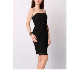 Elegantní koktejlové šaty v černé barvě se skrytým zipem. Vkusné záhyby a ozdobná růžička na přední straně.