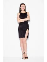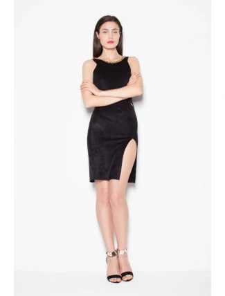 Jedinečné šaty z měkké semišové látky. Šaty jsou skromné, ale výřez na stehnech a řetízek šperků vytvářejí střih bez monotónnosti.