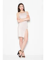 Jedinečné šaty z měkké semišové látky. Šaty jsou skromné, ale výřez na stehnech a řetízek šperků vytvářejí střih bez monotónnosti.