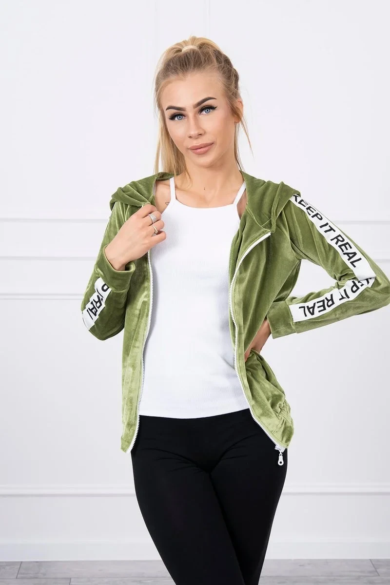 Prezentujemy Państwu modną bluzę z kapturem. Bluza wykonana z weluru. Bluza bez kieszeni z zapięciem na suwak. Na ramionach znajdują się ozdobne taśmy z napisem. U dołu bluza wykończona gumą. Bluza wykonana jest z wysokiej jakości materiału. Rozmiar jest uniwersalny i będzie odpowiedni dla Pań noszących rozmiar S, M lub L.