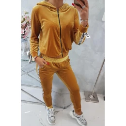 Představujeme vám sadu mikiny a kalhot. Sada z veluru. Mikina má kapuci a zapínání na zip. Ozdobná stuha na ramenou s nápisem. Ve spodní části mikiny je všitá guma. Kalhoty s kapsami a páskou na nohavicích. Velmi módní a stylová sada. Sada je vyrobena z vysoce kvalitního materiálu. Velikost je univerzální a vyhovuje dámám velikosti S, M nebo L.