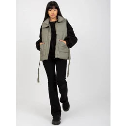Khaki péřová vesta s páskem a kapsami .