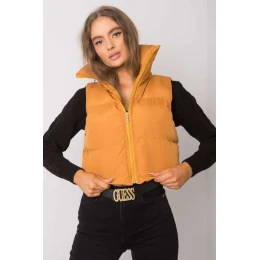 Tmavě žlutá vesta se skrytou kapucí. Vesta na zip.