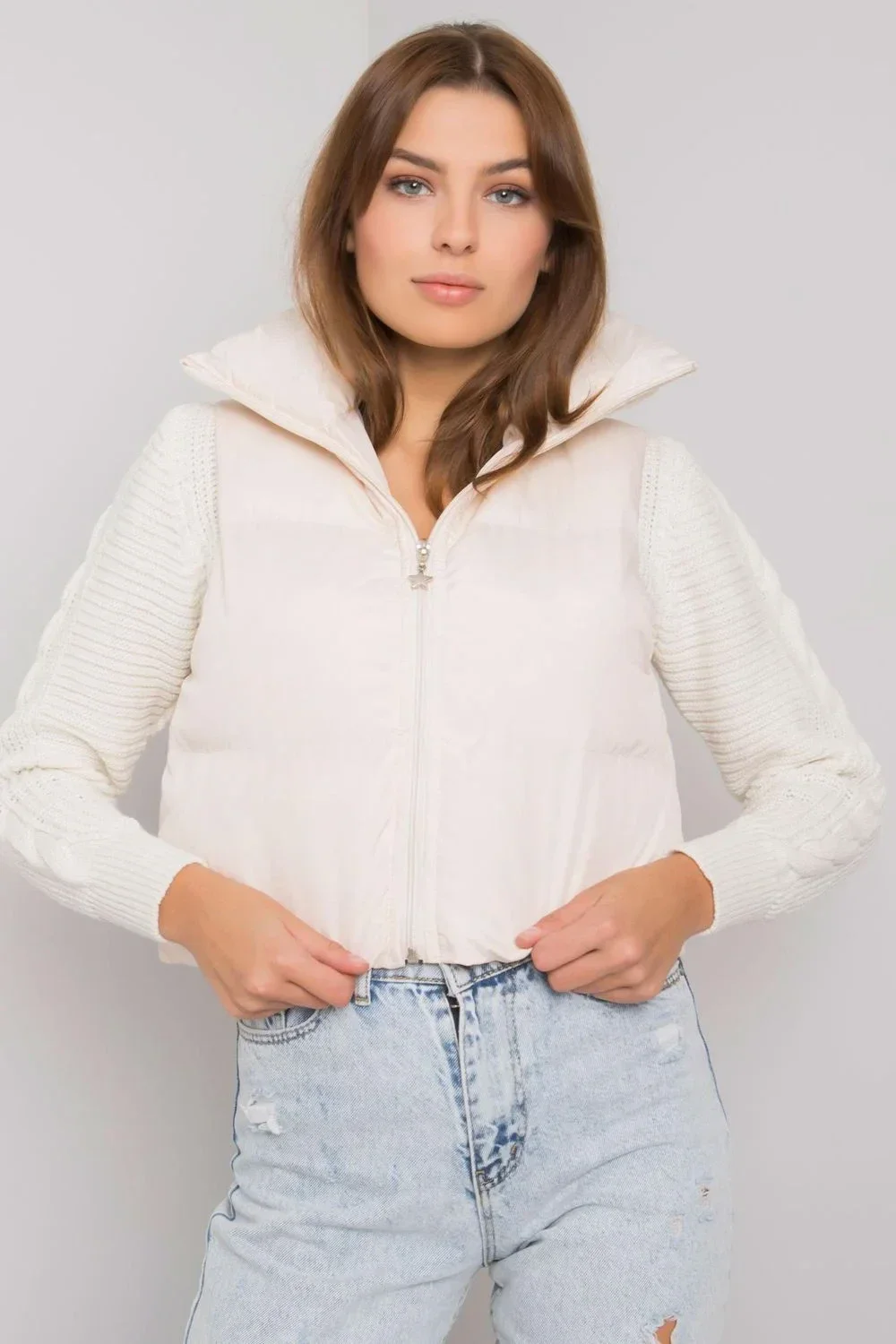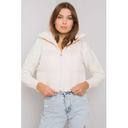 Vesta v barvě ecru se skrytou kapucí. Vesta se zapíná na zip.