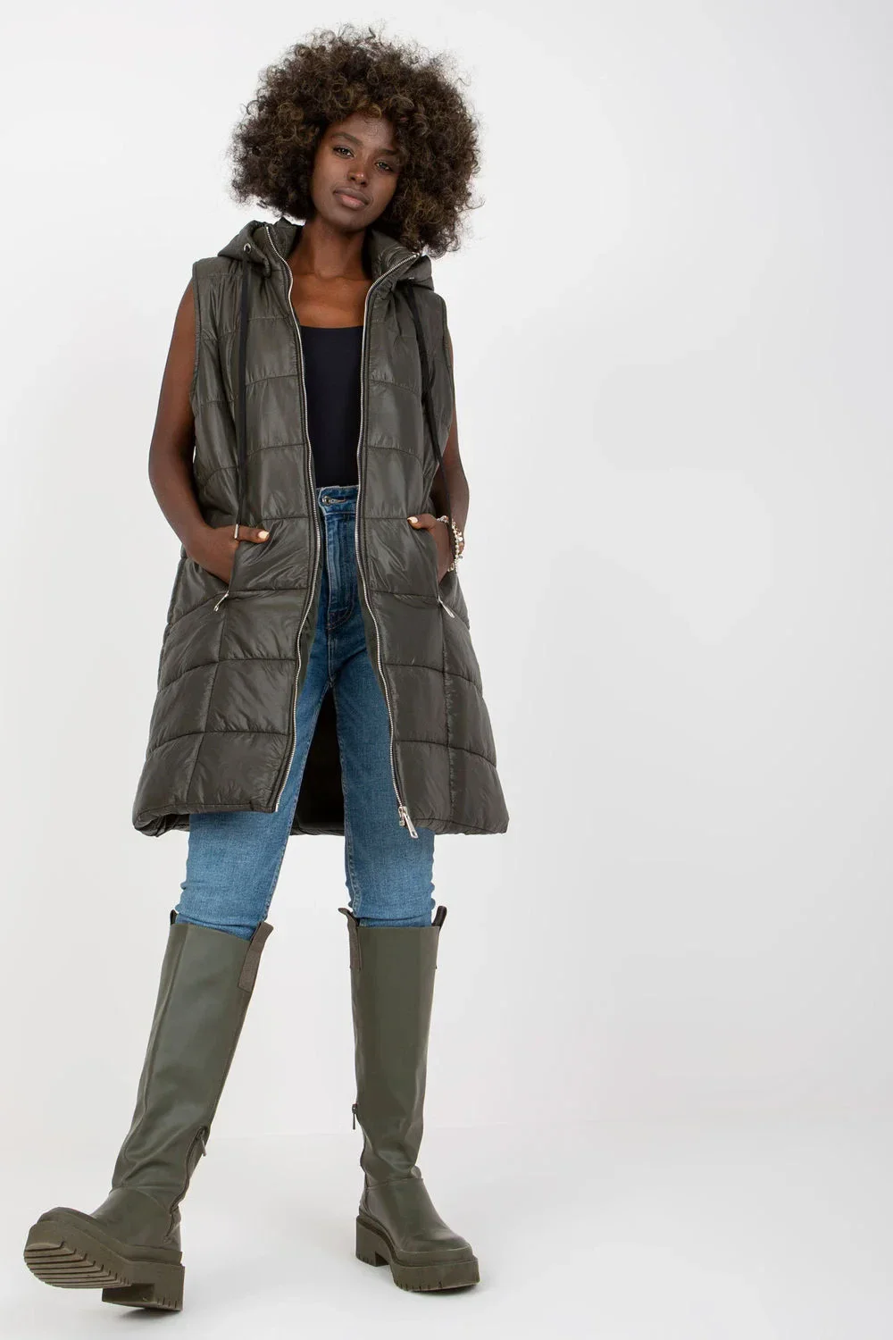 Prošívaná péřová vesta prodlouženého střihu se zapínáním na zip. Vesta s odnímatelnou kapucí, kapsy na zip na přední straně. Plně podšité.