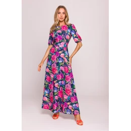 Šaty jsou vyrobeny z jemné látky s matným povrchem, zdobené vícebarevným květinovým vzorem, který dodává svěžest a dívčí půvab. Model kombinuje přiléhavý vršek s rozkročeným spodkem, který efektně vynikne díky vysokému rozparku, zdůrazňující nohy a dodávající lehkost siluetě. Výstřih vpředu je kulatý a zakrytý, zatímco záda jsou ozdobena jemným výstřihem, který celkově dodává smyslný charakter. Krátké, hutně ruchové rukávy s manžetou dokončují romantický styl šatů. Model má skrytý zip vzadu a zapínání na knoflíčky, které jsou elegantní a praktickým uzavřením. Vrchní část šatů je částečně podšívkována (95% polyester, 5% elastan), což zaručuje pohodlí a ideální uspořádání materiálu. Navrženo a ušito v Polsku s důrazem na detaily a ženský styl.