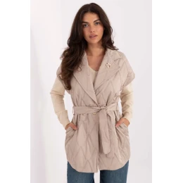 Elegantní dámský quiltovaný vestička standardní délky, zapíná se na knoflík a je vybavená klasickými límci. Vyrobená z polyesteru s syntetickou výplní, je lehká a pohodlná na nošení, zároveň je praktická v přechodném období ideální na podzim, zimu a jaro. Model se vyznačuje roztomilým quiltováním a různorodou strukturou materiálu, co mu dodává výjimečný charakter. V pasu je šňůrka k zavázání, která krásně zdůrazňuje postavu. Vložené kapsy přidávají funkčnost a brož na límci je elegantním, decentním akcentem. Je to ideální návrh na každý den a do práce spojující pohodlí, ženskou eleganci a nadčasový styl, vytvářející univerzální kus šatníku.
