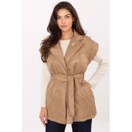 Elegantní dámský pikantní vesta standardní délky s knoflíkem a klasickými límci. Vyrobená z polyesteru s syntetickým plněním je lehká a pohodlná na nošení, zároveň praktická v přechodném období ideální na podzim, zimu a jaro. Model se vyznačuje roztomilým pikantním vzorem a různorodou strukturou materiálu, co mu dodává výjimečný charakter. V pase je šňůra k zavázání, která krásně zdůrazňuje postavu. Vložené kapsy přidávají funkčnost a brož na límci dodává elegantní, jemný akcent. Je to ideální návrh na každodenní nošení a do práce spojující pohodlí, ženskou eleganci a nadčasový styl, vytvářející univerzální kus šatníku.
