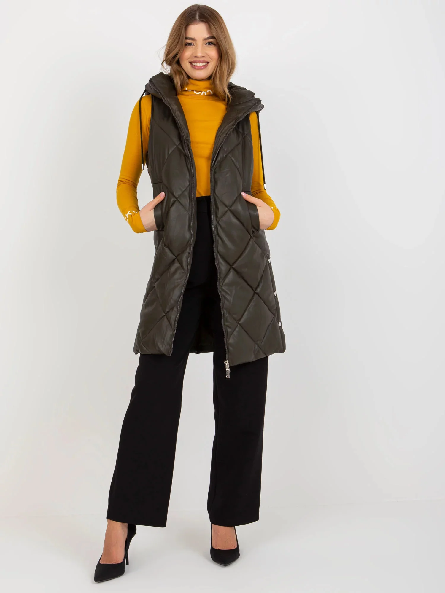 Khaki dlouhá prošívaná vesta z ekokůže .