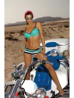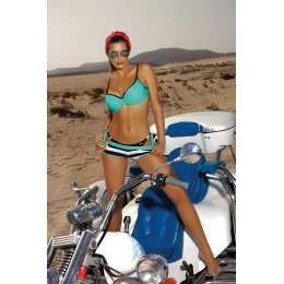 Senzační návrh na pláž. Lehce sportovní styl s velkou dávkou ženského sex-appealu. Hladký horní díl, určený pro malá a střední prsa. Střih dokonale sbírá, zvedá a opticky zvětšuje poprsí, takže je krásnou předností na sluncem prohřáté pláži. Košíčky jsou vyztužené jemnou pěnou, s podvazky a zabudovanou permanentní push-up výplní. Ramínka nastavitelná, obvod se zavazuje vzadu. Součástí kompletu jsou hladké kalhotky, svůdně zavazované na bocích, a šortky s pěknými proužky. Můžete je nosit společně nebo jedny na druhých (jako na obrázku) nebo každé zvlášť. Vytvořte si vlastní skvělé kompozice!