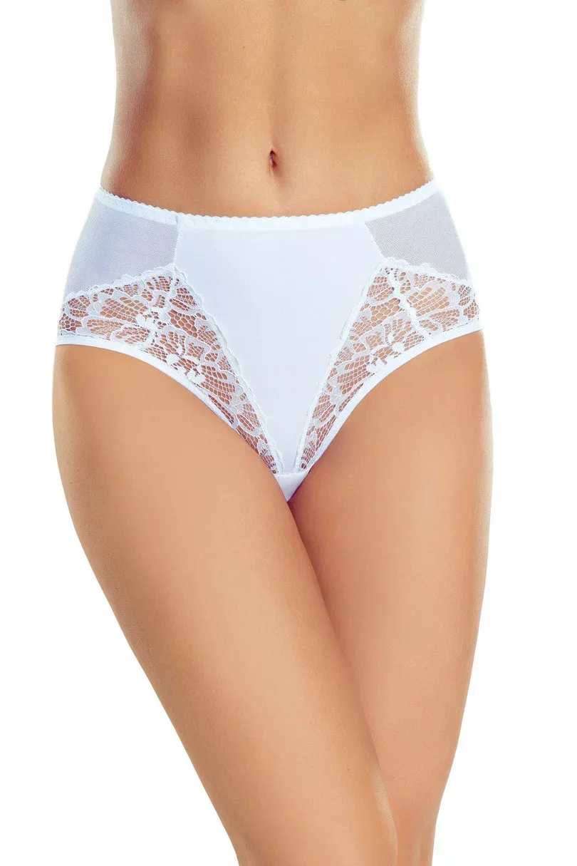 Dámské kalhotky vyrobené z elastické síťoviny. Přední stranu zdobí vsadka z mikrovlákna a krajky s květinovým vzorem. Modelují siluetu, s jemnou korekcí břicha.