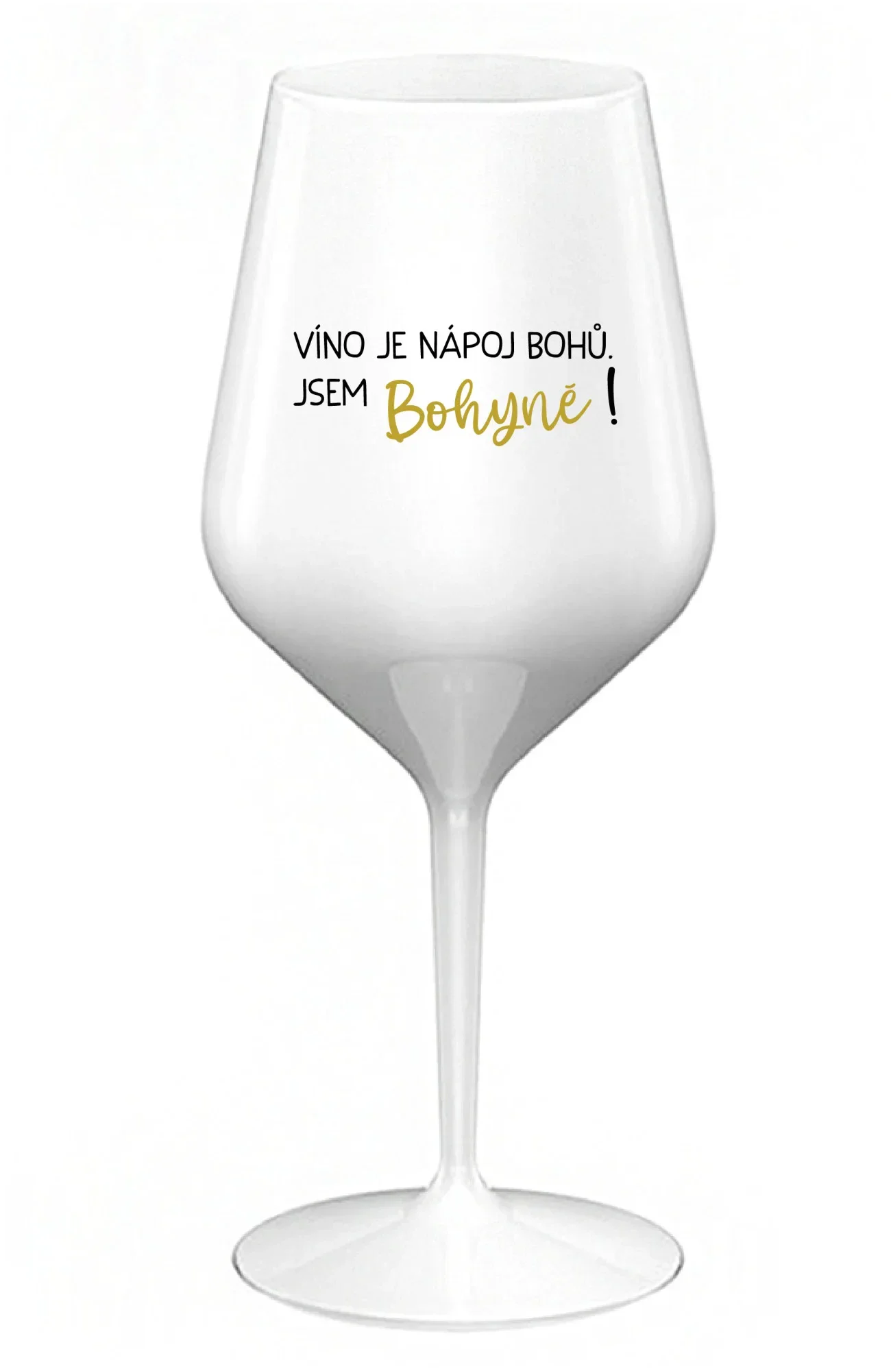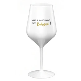 VÍNO JE NÁPOJ BOHŮ. JSEM BOHYNĚ! - bílá nerozbitná sklenice na víno 470 ml