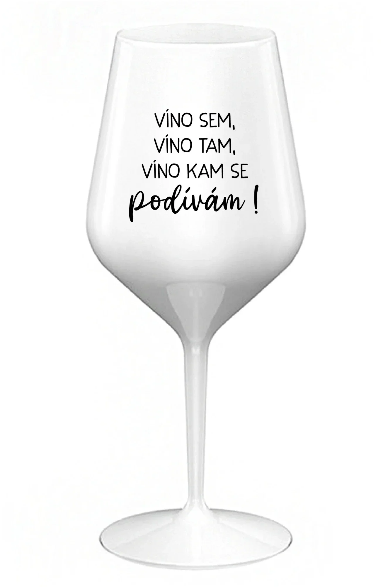 VÍNO SEM, VÍNO TAM, VÍNO KAM SE PODÍVÁM! - bílá nerozbitná sklenice na víno 470 ml
