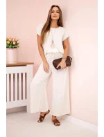 Objevte jedinečný komplet, který spojuje pohodlí a eleganci a vytváří dokonalý outfit pro každou příležitost. Vyrobený z lehké a prodyšné viskózy, poskytuje maximální komfort při nošení a zároveň vypadá velmi stylově. Plisovaná halenka s volným střihem jemně podtrhuje siluetu a dodává jí lehkost a moderní vzhled. Široké kalhoty dokonale ladí s halenkou a zajišťují volnost pohybu i elegantní vzhled. Celý komplet doplňuje ozdobný náhrdelník, který přidává jedinečný stylový prvek a eliminuje potřebu dalších doplňků. Tento set je ideální jak pro formální setkání, tak i pro každodenní nošení, kdy chcete vypadat elegantně, ale zároveň se cítit pohodlně. Vyberte si komplet z viskózy a užívejte si lehkost i nadčasový styl. Velikost je univerzální a vhodná pro ženy nosící velikosti S, M nebo L.