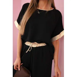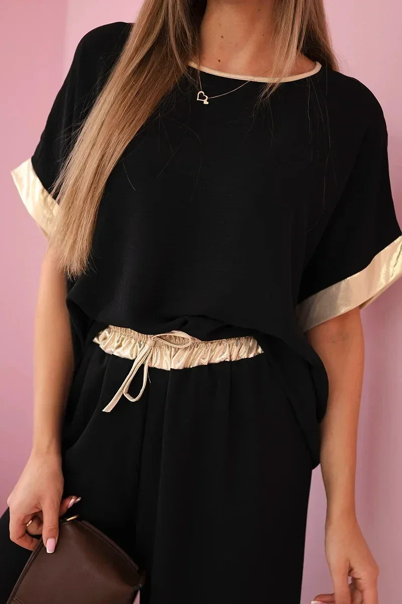 Tento jedinečný komplet spojuje pohodlí a elegantní styl, což z něj činí ideální volbu pro ženy, které ocení jemné, ale výrazné akcenty. Vyrobený z lehké, prodyšné viskózy, zajišťuje maximální pohodlí po celý den. Jemná tkanina krásně splývá s postavou a zvýrazňuje její přirozené přednosti. Zlaté lemování dodává celému outfitu výjimečný luxusní vzhled, přitahuje pozornost a přidává eleganci. Tento komplet je tak skvělou volbou jak pro každodenní nošení, tak i pro formálnější příležitosti. Můžete jej kombinovat s oblíbenými doplňky a vytvořit jedinečné styly odpovídající vašemu vkusu. Vyberte si viskózový komplet se zlatým lemováním a ciťte se elegantně a stylově v každé situaci. Velikost je univerzální a vhodná pro ženy nosící velikosti S, M nebo L.