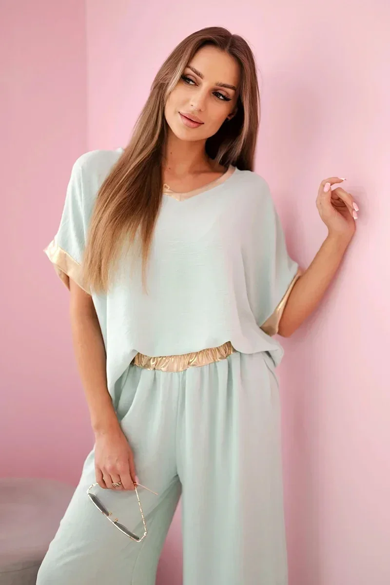 Tento jedinečný komplet spojuje pohodlí a elegantní styl, což z něj činí ideální volbu pro ženy, které ocení jemné, ale výrazné akcenty. Vyrobený z lehké, prodyšné viskózy, zajišťuje maximální pohodlí po celý den. Jemná tkanina krásně splývá s postavou a zvýrazňuje její přirozené přednosti. Zlaté lemování dodává celému outfitu výjimečný luxusní vzhled, přitahuje pozornost a přidává eleganci. Tento komplet je tak skvělou volbou jak pro každodenní nošení, tak i pro formálnější příležitosti. Můžete jej kombinovat s oblíbenými doplňky a vytvořit jedinečné styly odpovídající vašemu vkusu. Vyberte si viskózový komplet se zlatým lemováním a ciťte se elegantně a stylově v každé situaci. Velikost je univerzální a vhodná pro ženy nosící velikosti S, M nebo L.
