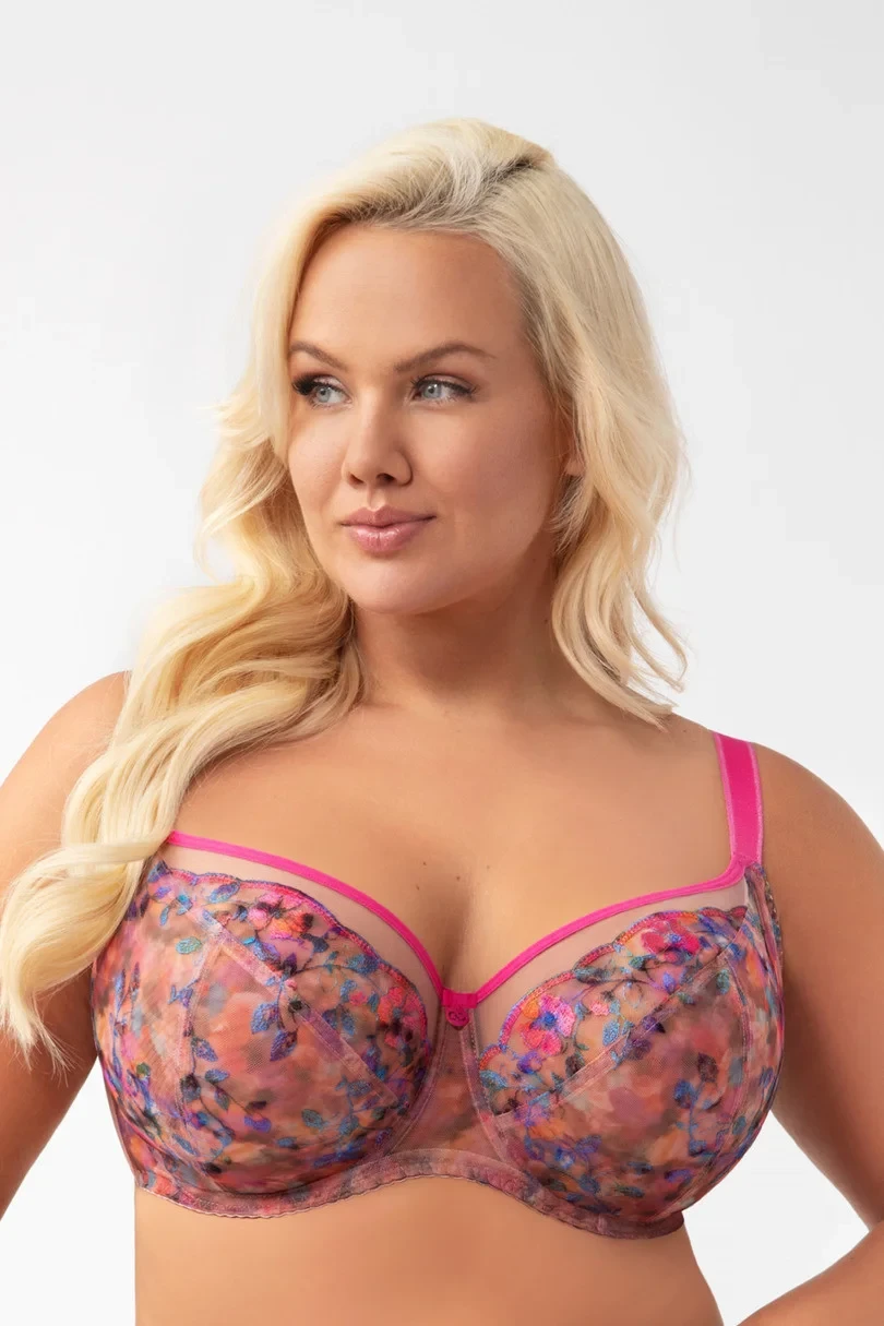Biustonosz miękki przeznaczony dla kobiet ze średnim, dużym oraz bardzo dużym biustem. Zapewnia efekt bardzo mocnego uniesienia i zebrania biustu do środka, 3-częściowe miski wykonane z haftu oraz plenu haftowanego z nadrukiem na tiulu stabilnym. Górna krawędź miski wykończona taśmą w kontrastowym kolorze przechodzi płynnie do ramiączka powodując lepsze podtrzymanie biustu. Tył z transparentnej lycry zapewniającej bardzo dobre dopasowanie i podtrzymanie. Fiszbiny boczne zapobiegające zwijaniu się materiału. W zależności od rozmiaru dwu lub trzyrzędowa haftka z trójstopniową regulacją obwodu. Nieodpinane, regulowane ramiączka w trzech szerokościach.Metalowe elementy w kolorze różowym (nie zawierają niklu)
