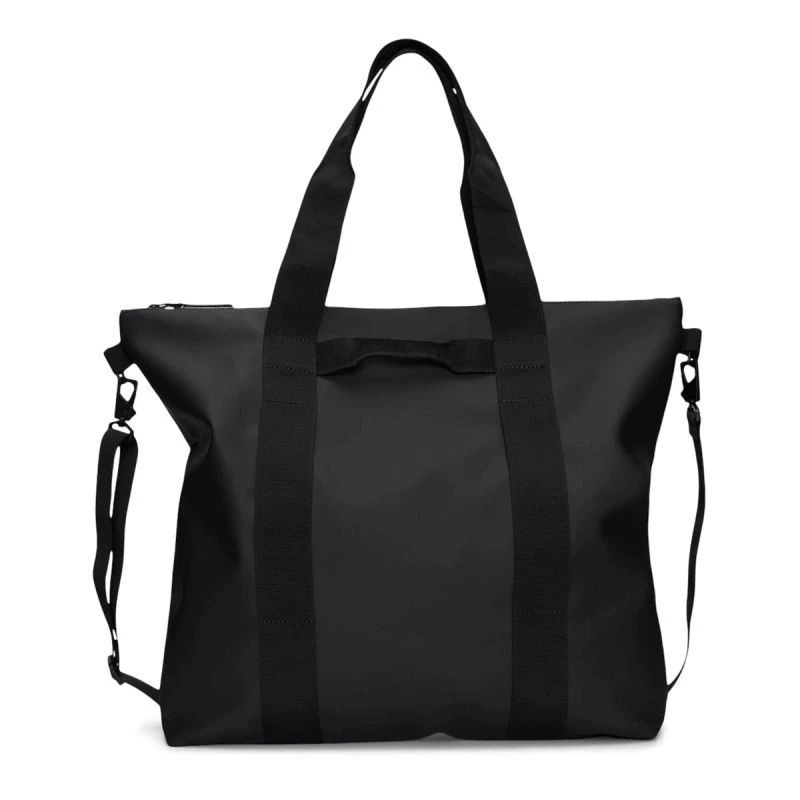 Tote Bag jest wykonana z charakterystycznej dla Rains tkaniny poliuretanowej, która zapewnia wytrzymałość, trwałość i gładkość w dotyku.