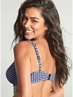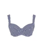 Drátěný horní díl bikin s plnými košíčkyVestavěná přední ramínka pro pohodlné nošení na ramenouZajišťuje pohodlné a podpůrné nošení až do velikosti košíčků K (US O)Vyrobeno z luxusní strukturované ginghamové tkaniny v námořnické a bílé barvěSladěte s kalhotkami Gingham Midi Gathered Bikini Bottoms pro sofistikovaný vzhled u bazénu