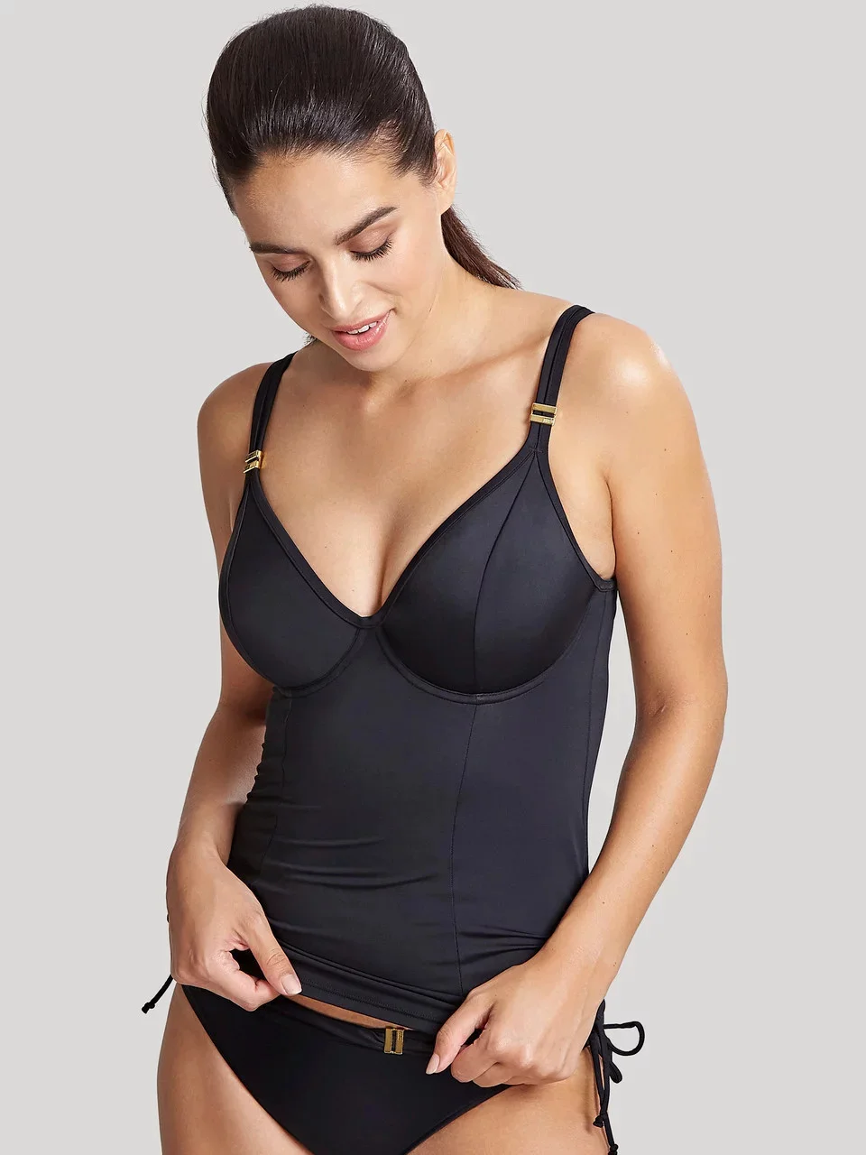 V plavkách Anya Riva Tankini se můžete cítit elegantně a sofistikovaně. Tyto všestranné tankiny s lichotivým výstřihem a vnitřními nevycpanými košíčky poskytují skvělou oporu od košíčků D až po J. Její drobné detaily, včetně dělených popruhů, stahovacích šňůrek na bocích a zlaté povrchové úpravy, působí luxusním dojmem. Pokud chcete mít univerzálnost bikin, ale zároveň zakrýt plavky, jsou pro vás tankiny tou správnou volbou! Košíčky jsou s kosticí, bez vycpávek (s dvojitou podšívkou) poskytují skvělou oporu. Vnitřní křidélka z powermeshové síťoviny poskytují podpůrný a pohodlný tvar kolem těla. Skryté vnitřní zapínání na zádech se zapínáním na háček a očko, pro možnost přizpůsobení velikosti.Nastavitelná ramínka. Zakončené zlatým lemováním pro větší luxus.