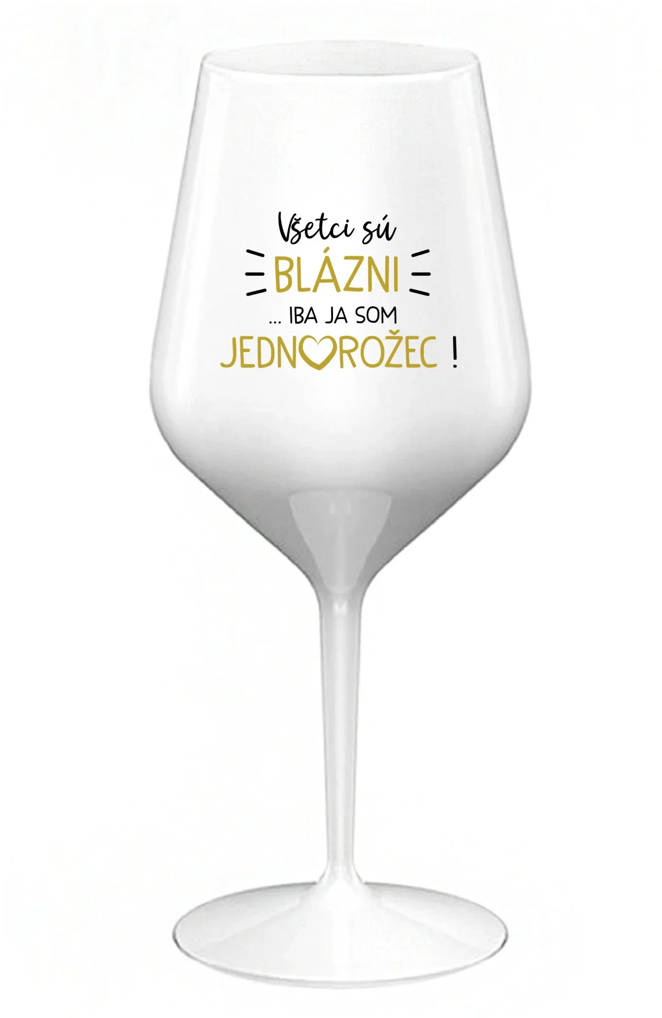 VŠETCI SÚ BLÁZNI...IBA JA SOM JEDNOROŽEC! - biely nerozbitný pohár na víno 470 ml
