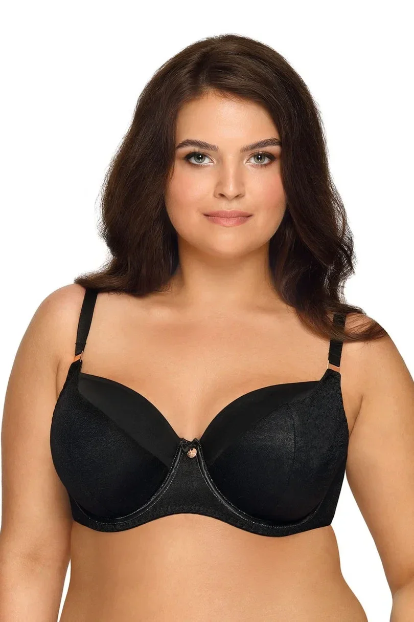 Vyztužená dámská podprsenka typu "full cup" dokonale obepíná poprsí, stahuje jej ke středu hrudníku a dodává mu požadovaný oblý tvar. Lehce lesklá pružná tkanina pokrývající spodní části košíčků a můstek je doplněná zajímavou látkou v horní části košíčků. Černé saténové pásky všité zlatou přízí zvýrazňují spodní linii poprsí. Kovové doplňky v barvě "rose gold" doplňují a rozjasňují celý model.