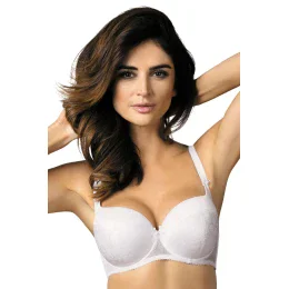 Elegantní vyztužená podprsenka, která dává prsů přirozeně zakulacený tvar. Košíčky jsou ozdobené lesklou krajkovou látkou a obvod z elastického tylu. Podprsenka je ozdobená atlasovou mašličkou s kamínkem mezi košíčky. Košíčky jsou třídílné, ušité z tenké korzetové pěnové látky a zevnitř jsou pošité bavlnou. Obvod je z elastického tylu. Ramínka mají regulaci, jsou neodepínací a ozdobená mašličkami. Na bocích má podprsenka svislé kostice. 65% polyamid, 20% polyester, 10% bavlna, 5% elastan.