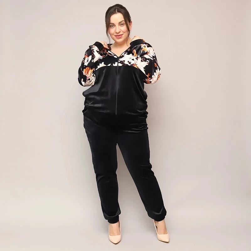 Černý dámský květovaný velurový komplet (8228)
