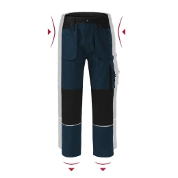 pruženka v boční části pasového límce 7 multifunkčních kapes zdvojený materiál v oblasti kolen a sedu plastové "D" poutko a karabina na klíče a ID karty poutko na kladivo dvojité prošití pro vyšší odolnost retroreflexní prvky