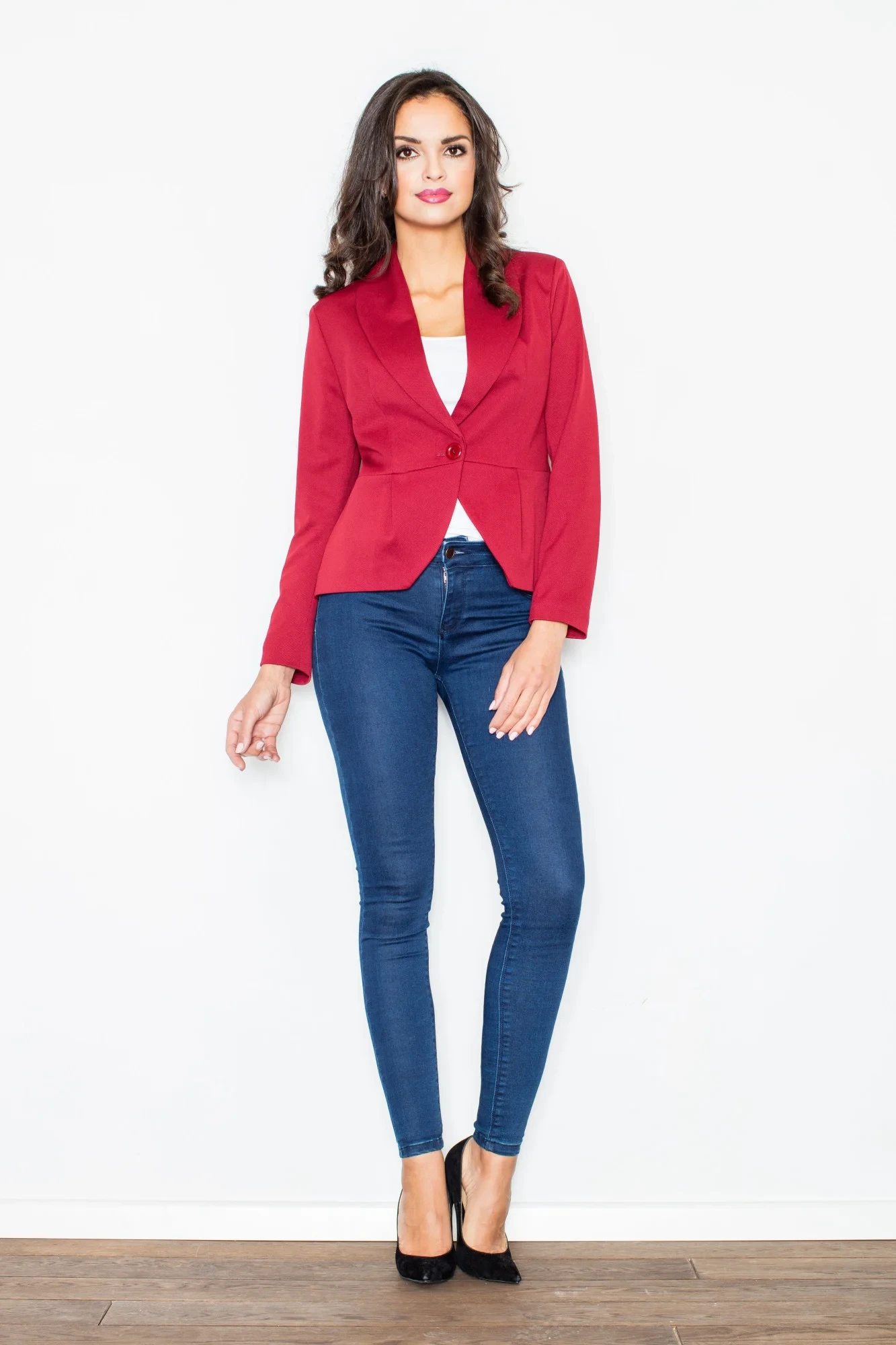 Nadčasové sako, které dokonale zvýrazní ženské přednosti. Má ozdobný límec, zapínání na jeden knoflík, dokonale tvarovaný střih, který opticky zeštíhluje siluetu, a podšívku, která zaručuje pohodlí a správné přizpůsobení postavě. Bude se hodit do práce i během chladnějších večerů.
