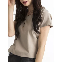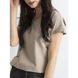 Tmavě béžovétričko Circle Hladké dámské tričko z bavlny příjemné na dotek si oblíbilo mnoho žen, které si bez něj nedokážou představit svůj každodenní outfit. Takový střih je velmi pohodlný a zároveň univerzální a nadčasový, protože se hodí k mnoha dalším oděvům a nikdy nevyjde z módy. Naše základní dámské tričko má klasický kulatý výstřih, krátké rukávy a volnější střih, který příjemně sedí na těle a neomezuje v pohybu. Je vyrobeno z vysoce kvalitního materiálu s převažujícím podílem čisté bavlny ve složení, takže tričko je prodyšné a příjemné na dotek. U tohoto modelu je k dispozici řada módních barev, které vypadají in-your-face a hodí se k jinému oblečení. Takové jednoduché dámské tričko vypadá skvěle v kombinaci s džínami, šortkami nebo sukní.