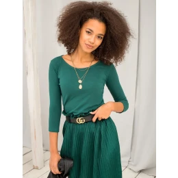 Modnych bluzek basic nigdy nie powinno zabraknąć w Twojej garderobie. Szukasz dla siebie wyjątkowego modelu, który wyróżni Cię na tle innych? Postaw na model z naszej najnowszej kolekcji online. Prezentowany model zachwyca wszechstronnością. Możesz założyć go zarówno do pracy czy na miasto, ale również na oficjalne rodzinne spotkanie. Bluzka basic posiada klasyczny okrągły dekolt oraz wygodne rękawy o długości 3/4. Dzięki swojej ponadczasowej formie pasują do różnorodnych typów odzieży oraz dodatków. Możesz po nią sięgać niezależnie od okazji. W każdym zestawieniu zaprezentuje pełnię swojego uroku. Jeśli marzy Ci się unikalny look na wieczorne wyjście, koniecznie sięgnij po naszą ciemnozieloną bazową bluzkę i dobierz do niej szykowną plisowaną solejkę oraz buty na obcasie. Całość możesz uzupełnić o złoty naszynik lub bransoletkę. W codziennym wydaniu bawełniana bluzka basic będzie świetnie wyglądała z ciemnymi jeansowymi spodniami oraz botkami. Wielk