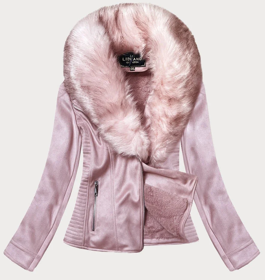 Dámská semišová bunda ramoneska v pudrově růžové barvě s kožešinou (6501big)