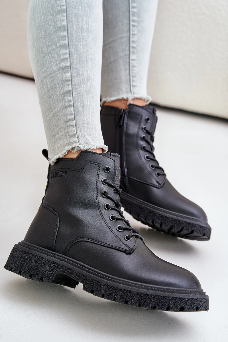 Boty značky Big Star vyrobené z eko kůže jsou stylovou a funkční obuví na chladnější dny. Model se zapínáním na zip a navíc šněrováním, což zajišťuje dokonalé přizpůsobení. Vnitřek je zateplený, což zaručuje termální komfort. Špičky jsou zaoblené, což dodává klasický vzhled. Ideální pro každodenní stylizace, které spojují pohodlí s módním vzhledem. Při výběru velikosti se řiďte tabulkou velikostí.