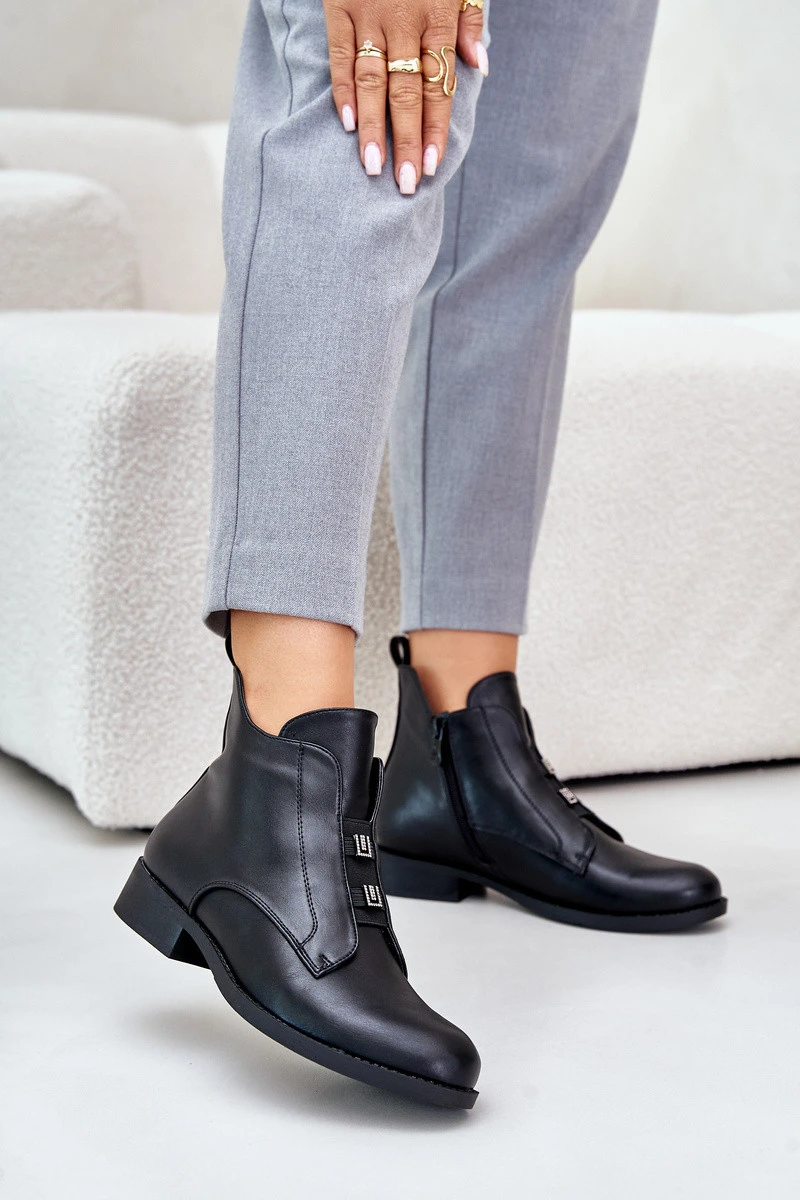 Dámské boty vyrobené z eko kůže jsou kombinací stylu a pohodlí, ideální na chladnější dny. Uloženy na plochém podpatku, zaručují komfort při nošení. Model má zaoblené špičky a dvě decentní ozdoby vpředu, které dodávají elegantní charakter. Zapínání na zip usnadňuje obouvání a vnitřek zateplený obuvnickým rounem zajišťuje teplo a pohodlí. Ideální pro každodenní stylizace. Při výběru velikosti se řiďte tabulkou velikostí.