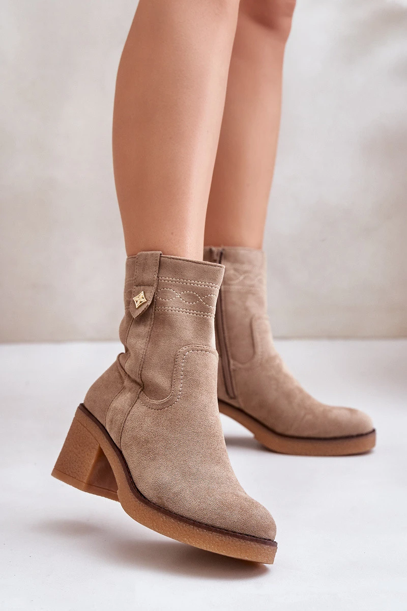 Klasické dámské boty vyrobené z eko semiše. Umístěné na podpatku ve tvaru sloupu. Špičky jsou zaoblené. Tento model se vyznačuje prošíváním na svršku a malým detailem. Vnitřek je zateplen měkkým obuvnickým rounem, ideální na chladnější dny. Při výběru velikosti se řiďte tabulkou velikostí.